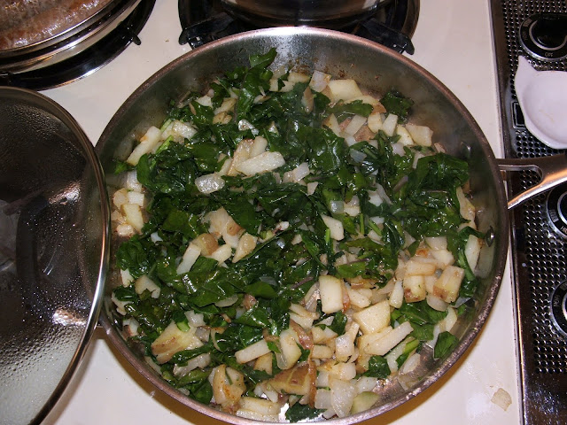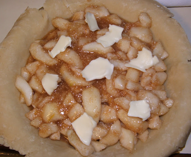 4. Pour the pear filling into the bottom pie crust and "dot" with the blobs of butter. (Remember - the 3 main ingredients of French cooking/baking is Butter, Butter and Butter - I think that was said by Julia Child or some famous french cook :-)).