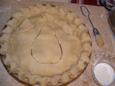 5. Place the (already rolled out) top crust on the pear filling and flute the edges. Always make sure to cut a few holes in the middle of the top crust so that the air can escape, otherwise the filling will overflow from the fluted seam (and make a huge mess on the bottom of your oven). I like to be a little creative and I cut out a pear shape but any little cut line or hole will work.