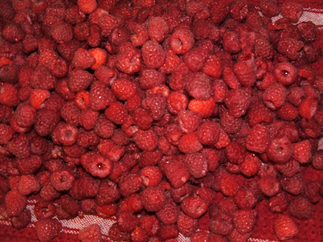 To make the juice: Place your washed raspberries and water in a stainless steel pot. Boil for 10 minutes and allow it to cool to room temperature. Then, line a strainer with your jelly bag or cheese cloth and pour the boiled fruit mixture into this lined strainer (you are sifting out the seeds and fruit pulp). Allow the juice to drain on it's own for a few minutes and then you may take the bag or cheese cloth and gather it together like a bag and squeeze out the remaining juice. Compost the seeds and pulp. Use the juice for the next steps below.