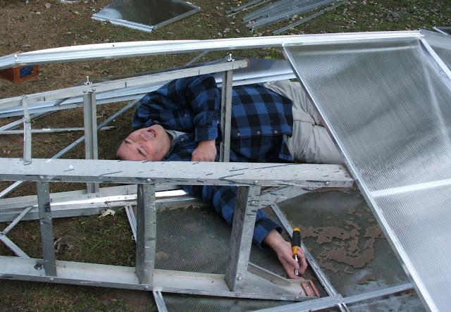 Honestly though - my husband was NOT injured. The greenhouse did flip over but thank the good Lord nobody was inside at the time. In these pictures my husband was posing - he was actually unscrewing the greenhouse taking apart the pieces.