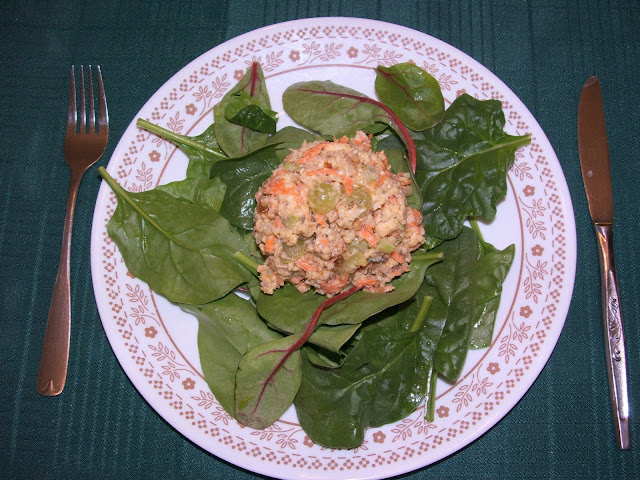 I like to serve a scoop of this salad on top of a bed of fresh greens - the greens that I used are a mix of Swiss Chard, Baby Bok Choy/Pak Choi, Arugula and Tender Spinach.