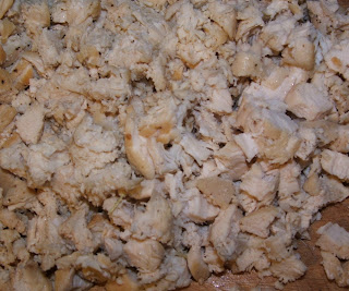 Step 3: For the chicken: I have used leftover cooked chicken, rotisserie chicken or I have sauteed my own chickens strips with a little white wine and garlic salt (the wine sauteed is my favorite). Once the chicken is cooked and cooled - then shred or finely chop.