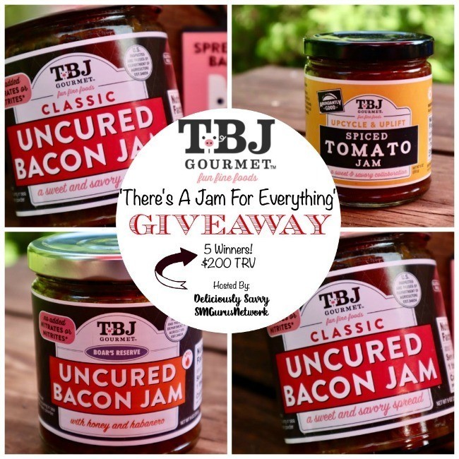 5 Lucky Winners will win a 3 pack of delicious jams! TBJ Gourmet's Classic Bacon Jam, TBJ Gourmet Honey Habanero Bacon Jam and TBJ Gourmet's Spiced Tomato Jam! TRV $200!