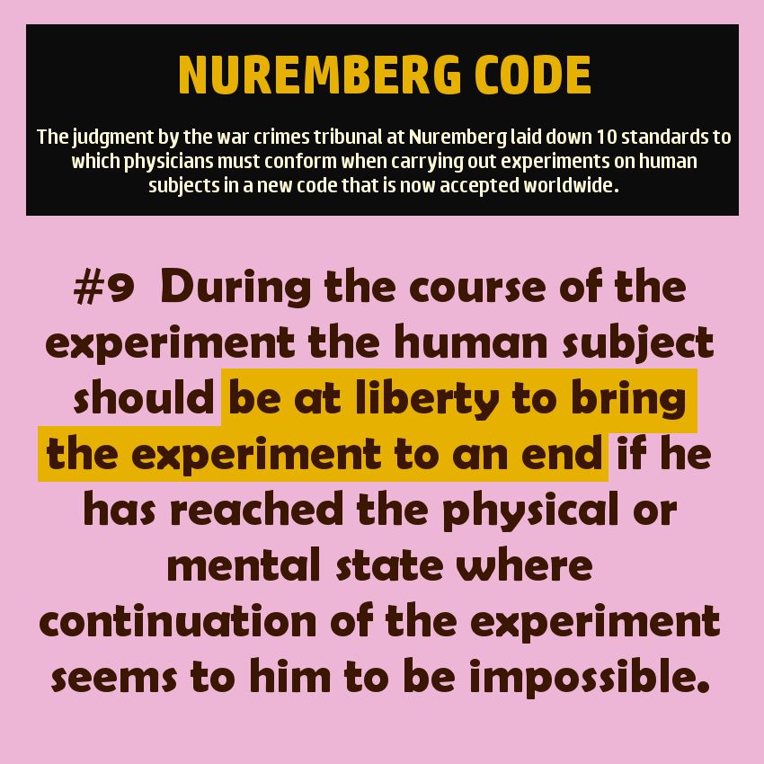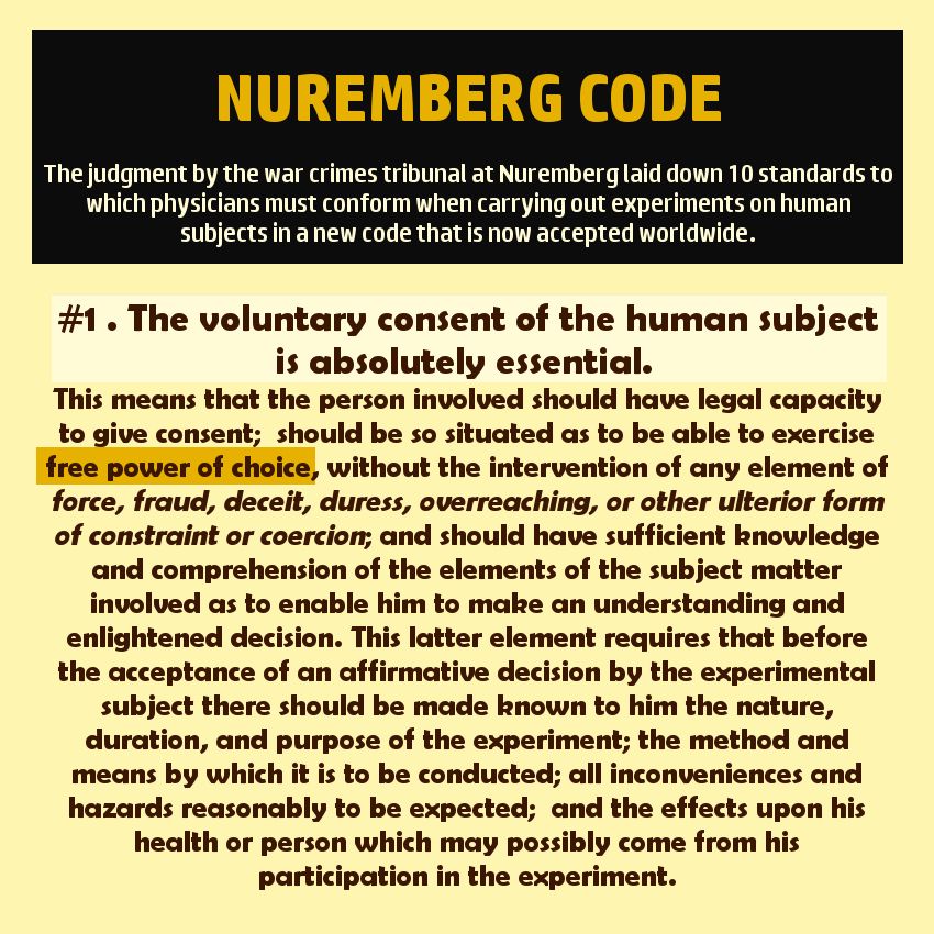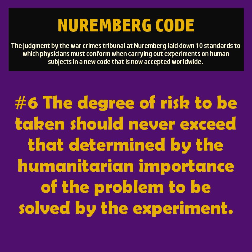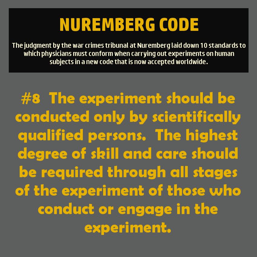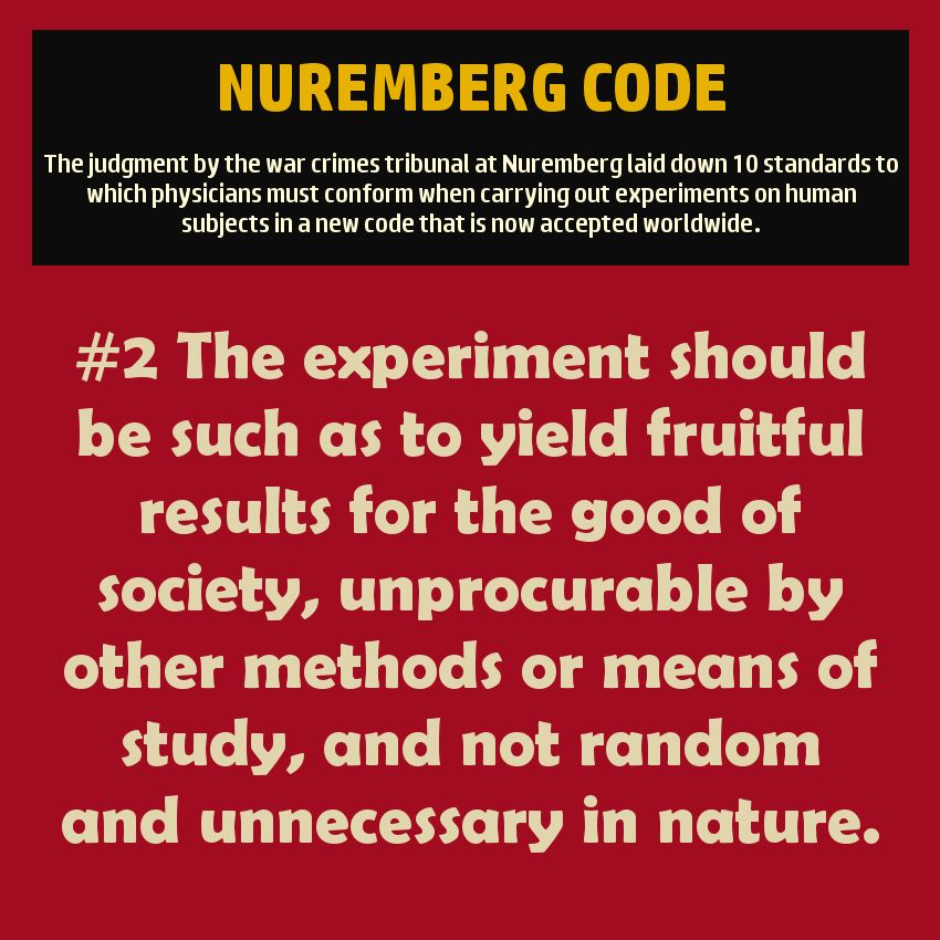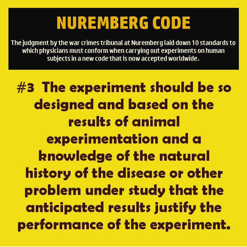 Clarification/Disclaimer - I hesitated to include a disclaimer because this might do the very thing that I am trying to avoid - candy-coat history and thereby not tell the whole truth. The information below lists and details the Nuremberg Code. By no means am I saying nor implying that I hate nor discriminate against any race, nationality, gender or religious group. I am also NOT condoning any behavior/action detailed in history.
