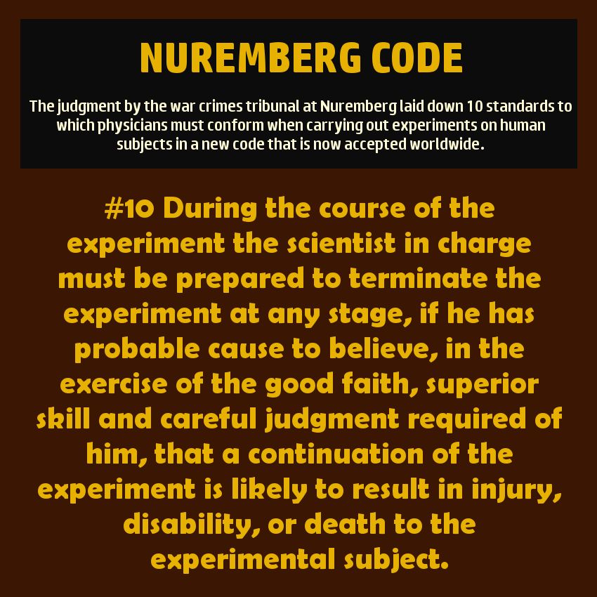 Last time we learned about the "Nuremberg Trials" (click HERE to view that post). Today we are going to be learning about the "Nuremberg Code", which was established during the Nuremberg Trials in 1947. This "Code" is a list of 10 standards of ethical medical behavior that ALL physicians are to adhere to in the post WWII era (These are all still valid TODAY). Almost every country in the world signed the Nuremberg Code. The 10 standards are listed below and I detailed certain points for some of the standards.