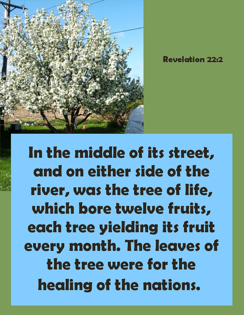 My favorite passage about fruitful trees is in Revelation. The Bible verse below is describing what it will be like in heaven with the "Tree of Life" producing twelve different fruit each month! Also, interesting about that verse is that the leaves will heal the nations.