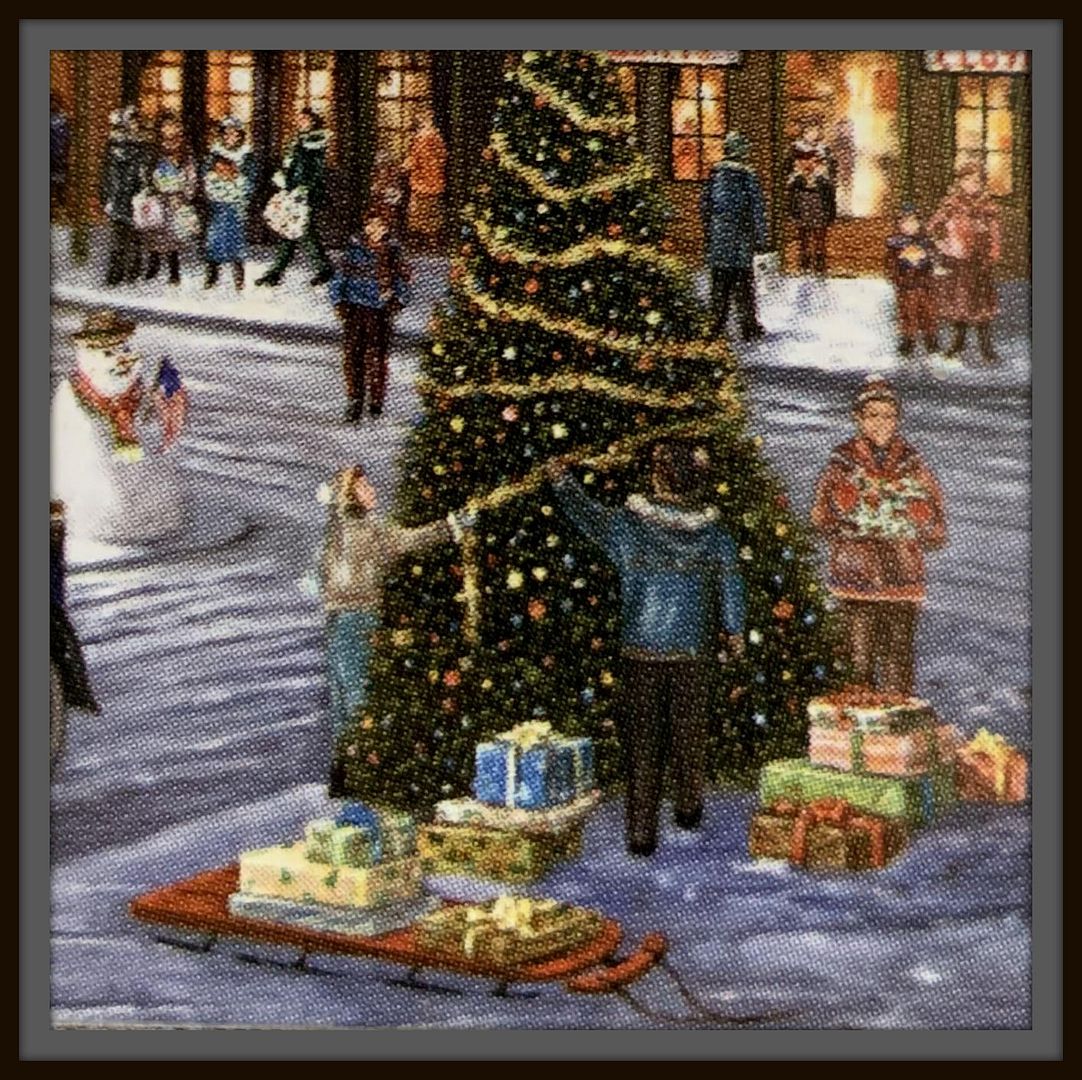 A town-square Christmas tree lighting with many generous gifts underneath.