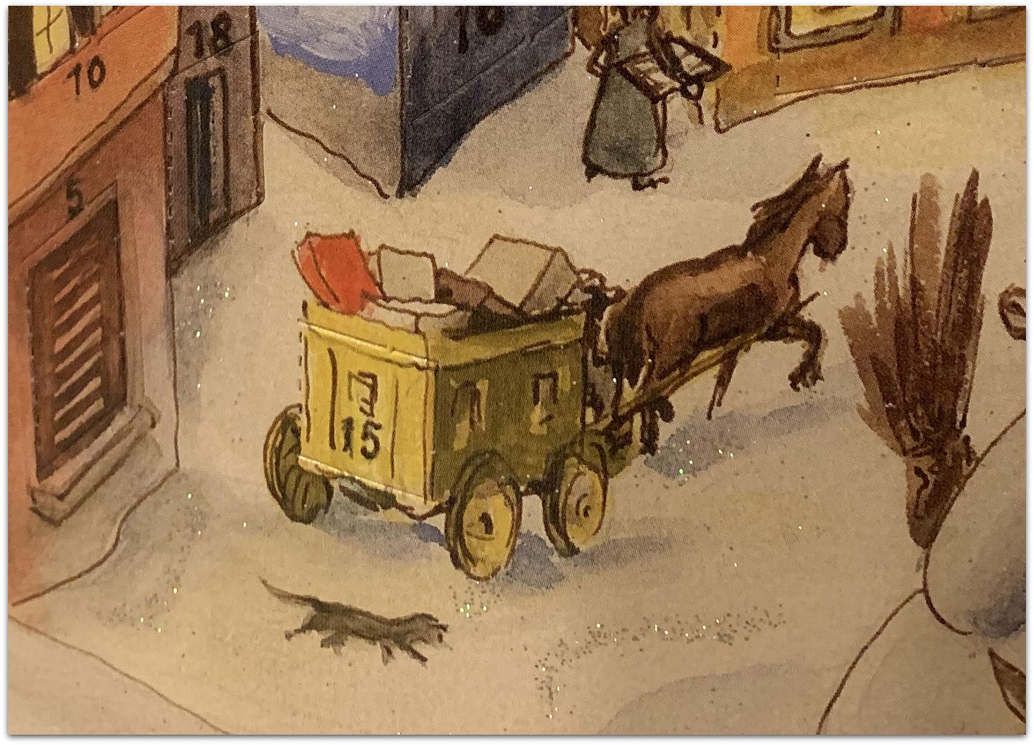 A horse-drawn cart full of gifts (also, notice the cute cat quickly running across the street behind the cart)