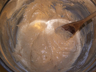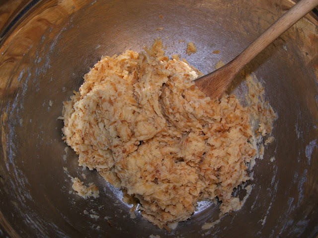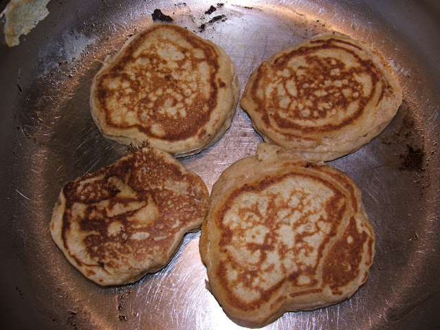 Whisk together the egg, milk, sugar, butter, vanilla and sweet potato (see small picture above on the left). With a wooden spoon stir in the flour, cinnamon, salt and baking powder. The dough will be quite thick for pancake batter (see top right picture).