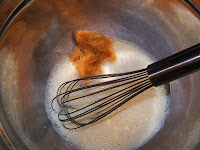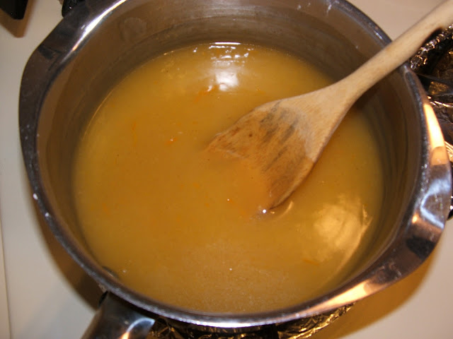 In a medium saucepan - stir the sugar, cornstarch, flour, cinnamon and salt together. Slowly add (while stirring) the orange juice and water and keep stirring until sugar is disolved. Now add in the orange zest. (The syrup should look cloudy like the picture below).
