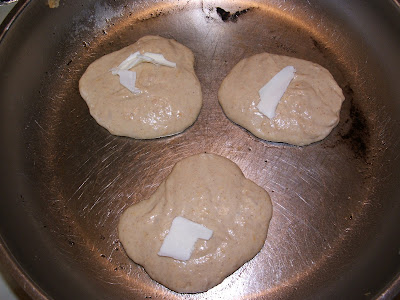 Now drop a ladle of pancake dough on a preheated frying pan (I dot each pancake with a little butter because I like a thin crisp outer layer on my pancakes - omit the butter if you don't want that crisp layer). Flip each pancake once and heat until done - now your pancakes are ready for the orange syrup!