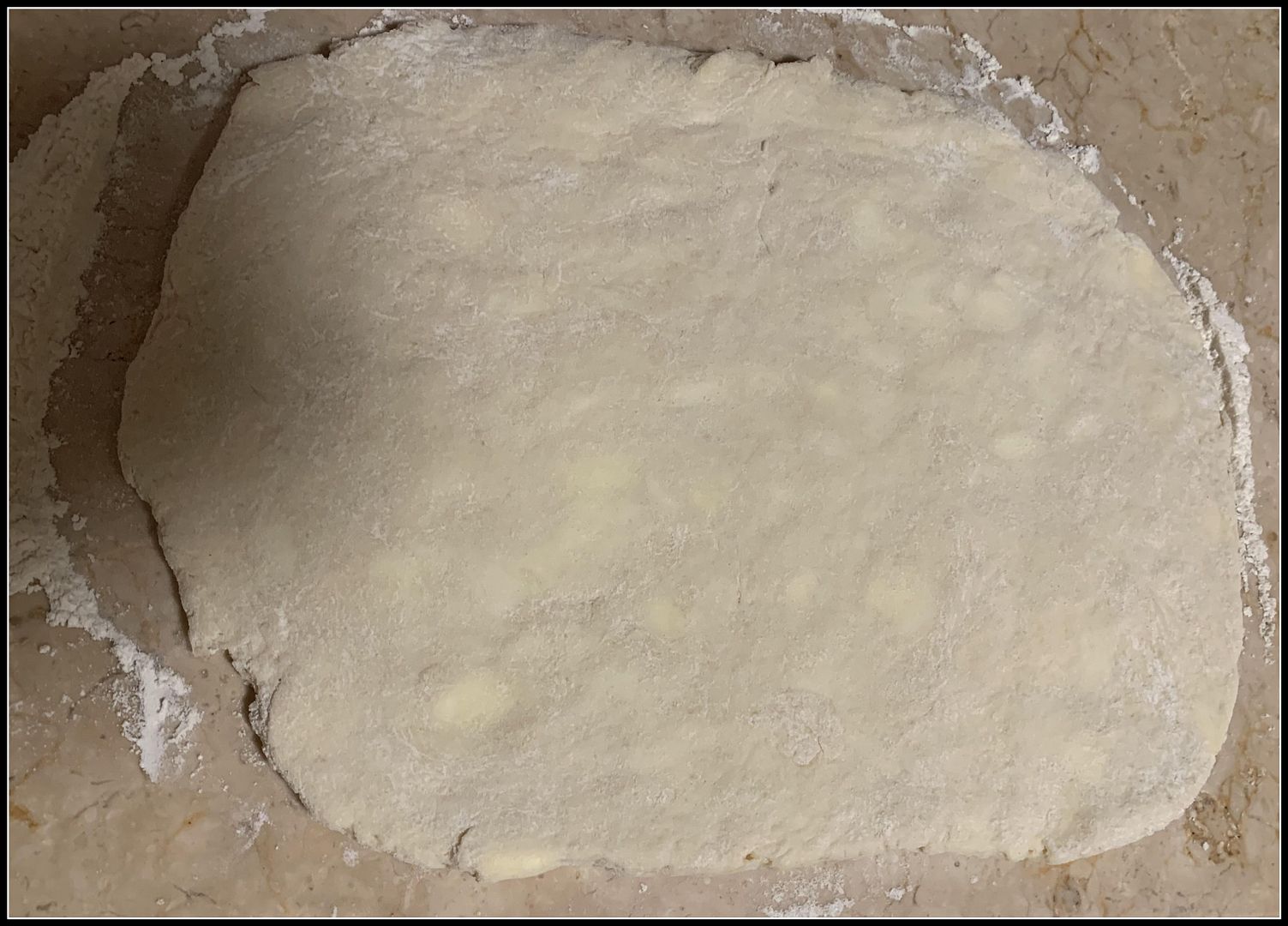Using your hands, form the dough together into a ball. Then, on a lightly floured surface roll the dough (about 1/2 inch thick)(see picture below).