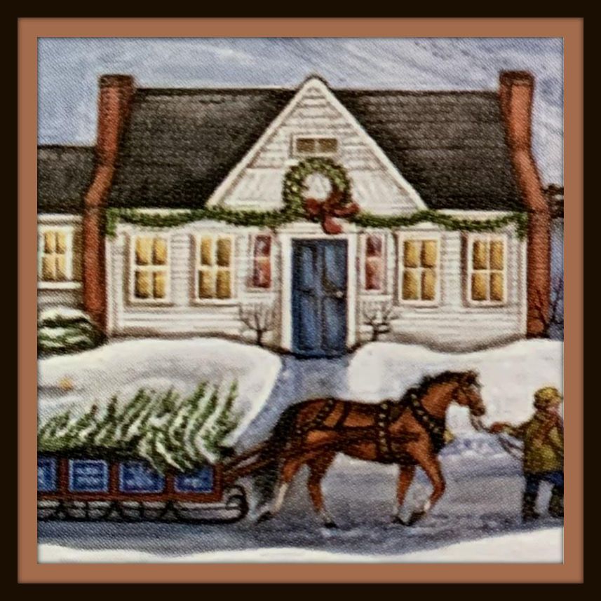 A horse-drawn carriage delivering a fresh Christmas tree to a beautifully decorated home